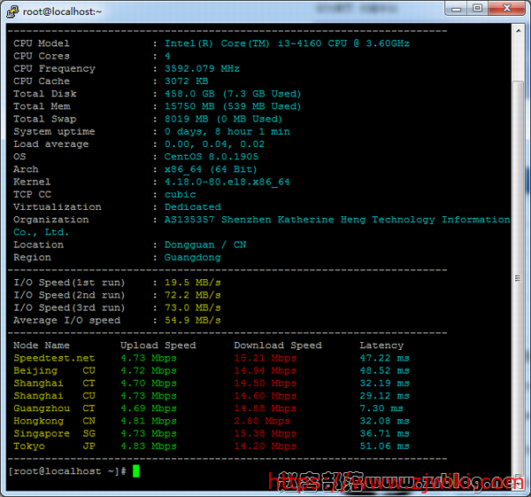 这些机器可选择Windows或者Linux操作系统,我也拿到一个I3测试机器,5MCN2带宽,安装了CentOS系统,下面列出部分简单测试信息,大家可以做个参考。