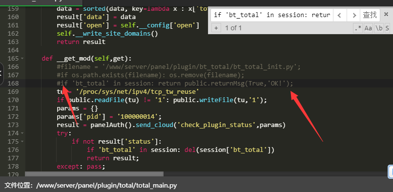 搜索“if ‘bt_total' in session: return public.returnMsg(True,'OK!');”
