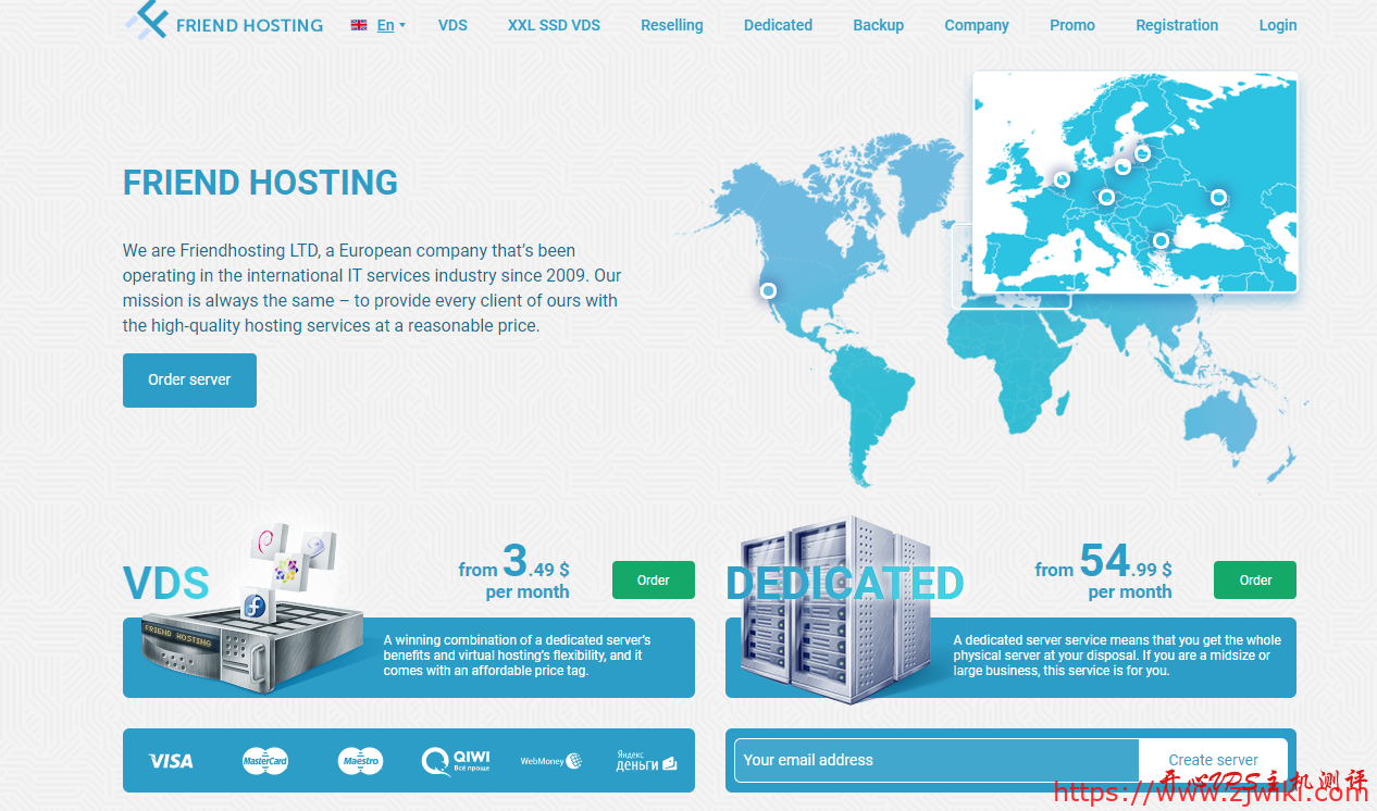 根据About us页面信息,Friendhosting是一家成立于2009年的保加利亚主机商,提供VDS和独立服务器,数据中心可选美国洛杉矶、保加利亚、乌克兰、荷兰、拉脱维亚、捷克和波兰等6个地区机房,其中VDS均为不限流量方式。商家的支付方式除了我们常见的PayPal外,还支持支付宝或者微信付款。最近,主机商还针对中国客户提供了一个5折优惠码,适用于1-3个月的首次付款(续费原价),优惠后首月最低1.75美元起。