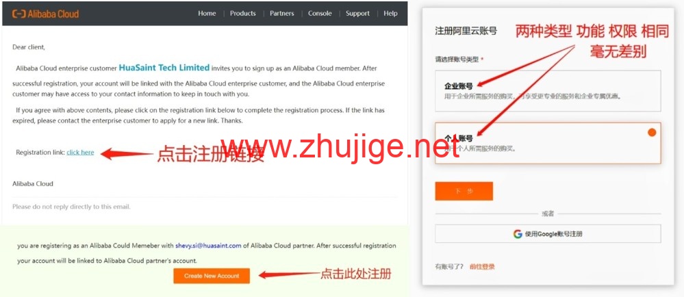 通过 发给您的邀请链接(点击click here)创建新账户,账户类型选择个人。