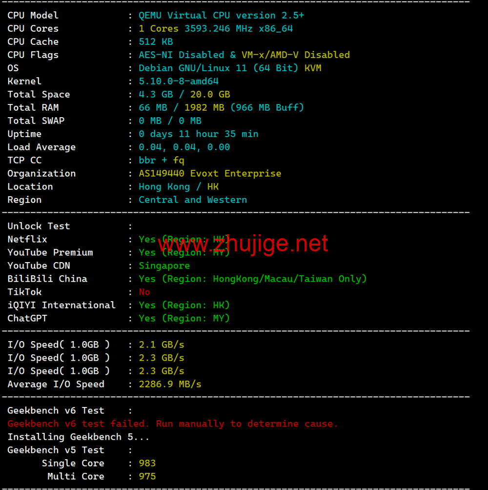Evoxt上新了香港机房,加上之前的美国洛杉矶、英国伦敦、马来西亚以及德国机房,一共五个机房,基础套餐,1核/512MB内存/5G硬盘/500G流量,$2.99 /月起,本文做个相关测评,需要的可以围观。