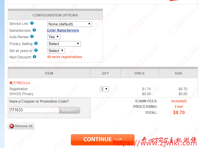 选择CO域名点击下方的蓝色按钮,进入选择域名界面,直接选择5年,输入优惠码771633就可以,如果你不是新用户,那么你再注册一个就可以,换个支付方式就成新用户了。