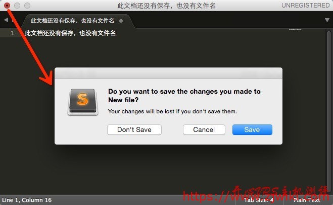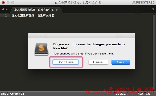 现在当我再次试图关闭一个未保存的文件时,新弹出的对话框如下,有了些许变化,在[Don't Save]按钮上多了一个蓝色的外框,当你按键盘上的tab键的时候,蓝色的外框会在3个按钮间切换。 假设现在蓝色的外框在[Don't Save]按钮上,你按下回车,却发现系统依然进入了保存文件对话框,为什么蓝色的外框不起作用呢?那是因为蓝色的外框选中的按钮是由空格键触发的,当你按下空格键,系统就会不保存文件直接退出。 这样当你不方便使用鼠标和触摸板的时候,可以更快速的和你的MacBook交互。