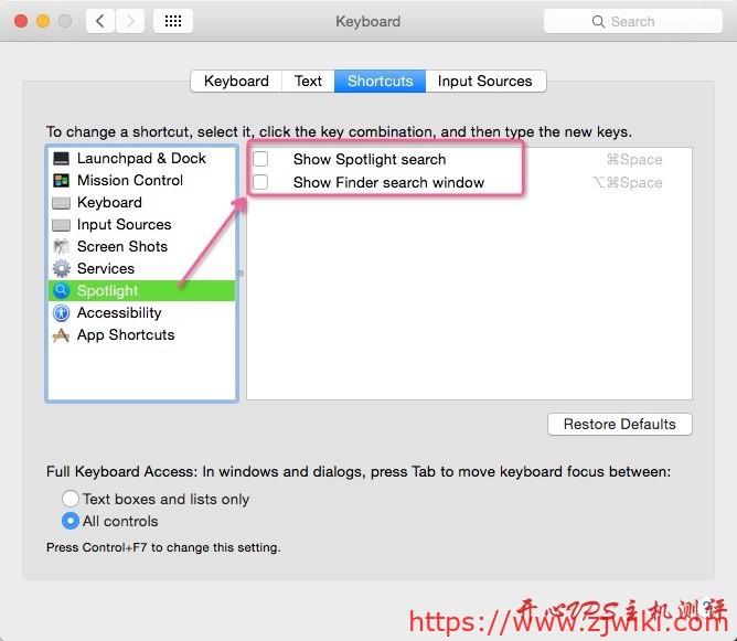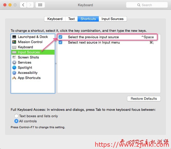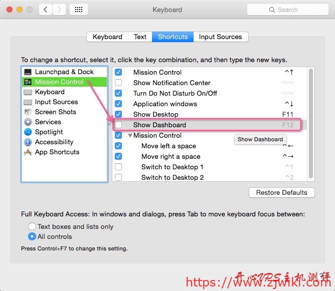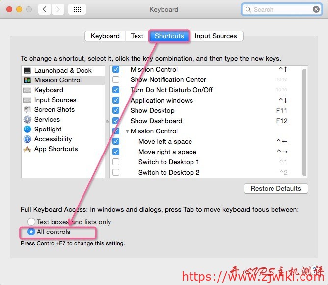 如图,首先打开System Preferences,点击Keyboard图标,选择Shortcuts这个Tab, 选中All controls