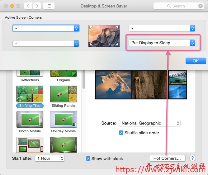 System Preferences,点击Desktop & Screen Saver图标,选择Screen Saver这个Tab,再点击Hot Corners...,在弹出的如下界面里面,右下角选择Put Display to Sleep,点击OK确定。 -