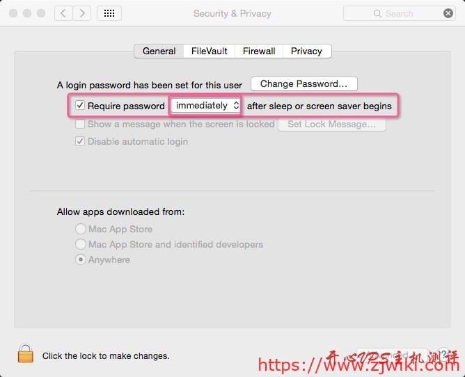 System Preferences,点击Security & Privacy图标,在GeneralTab内,勾选Require password[immediately] after sleep or screen save begins。