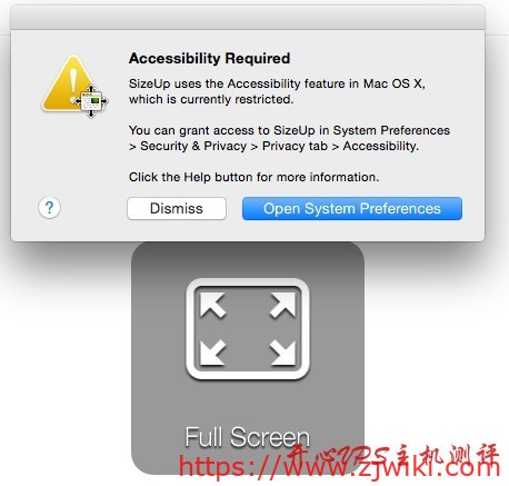 然而大部分情况下,你会看到如下这个提示,这是因为SizeUp需要你的授权才能控制窗口。