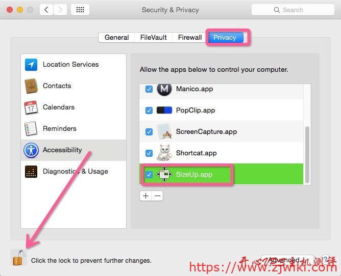 直接点击Open System Preferences或者打开System Preferences,点击Security & Privacy图标,在PrivacyTab内,点击Accessibility,然后将SizeUp加到右边的列表里面。(提示:你可能需要先点击右下角的黄色锁,输入密码后才能编辑右边的列表。)