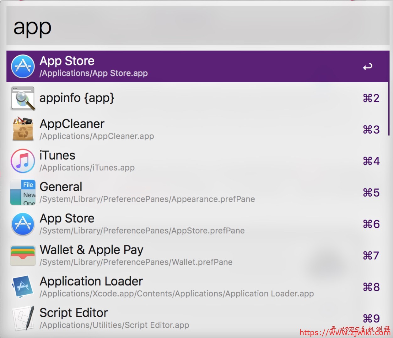 现在按下快捷键command + 空格,输入app,则Alfred不区分大小写的将所有包含app的应用程序,文档以及历史网址都列出来了,如下图所示,回车打开App Store,command+3打开AppCleaner,你还可以移动键盘上下键或者光标来选择目标。