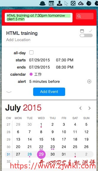打开Fantastical 2的网站,你一定会被她漂亮的外表所吸引,最可贵的是Fantastical还很聪明,当你在日历里面新建一个提醒的时候,输入如下内容“HTML training at 7:30pm tomorrow alert 5 min”, 则Fantastical会自动将日期设置为明天,然后将开始时间设置为晚上7点半,并且提前5分钟提醒,是不是很聪明?