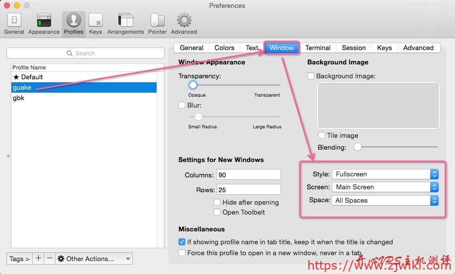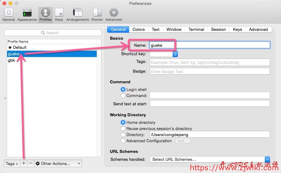 Preferences..., 在ProfilesTab里面,点击下面的[+]添加一个新的profile,为什么要新建一个profile?答案是为了定制将来弹出的终端样式和大小等等参数。新的profile假设命名为guake,(注:guake这个名称是为了向Linux下的Guake终端致敬),你可以自己任意起个名称,下面会用到。