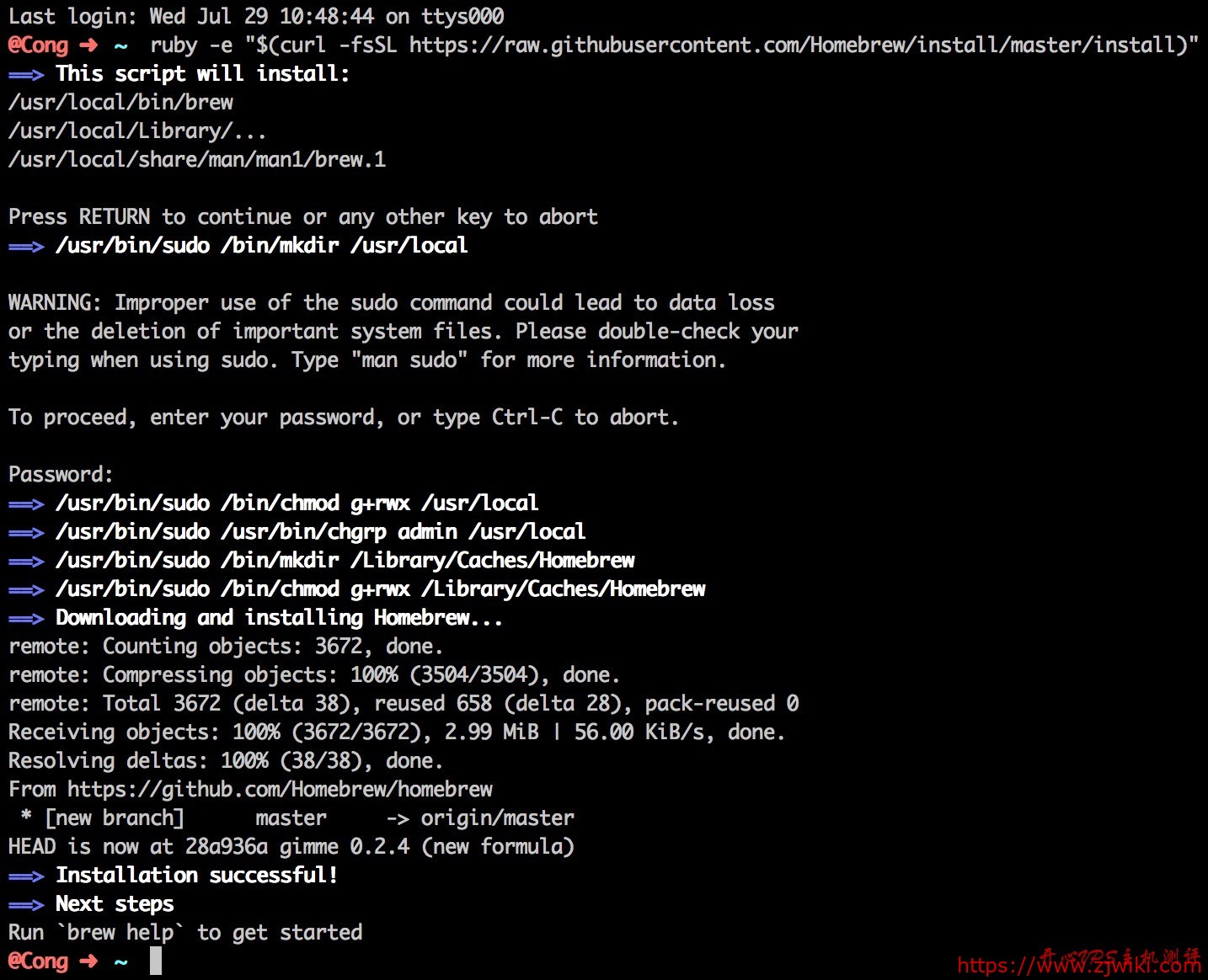 Homebrew就是这样一款终端下的命令程序包管理器,安装非常简单,复制如下命令在终端下运行,按回车并输入密码后等待安装成功: