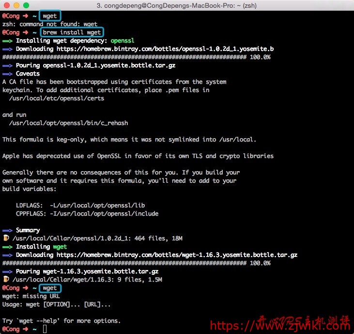 curl和wget是命令行下面常用的命令,其中curl已经默认安装在OS X中了,但是wget没有默认安装,下面演示如何使用Homebrew来安装wget。