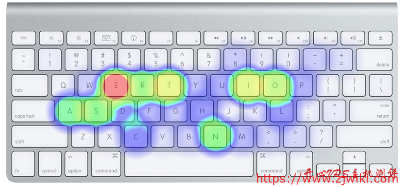 请看下图,是一个典型的Mac键盘布局,其中彩色的部分称为键盘热区,有键盘强迫症的人不仅仅手不会离开键盘,他们的手甚至都不太愿意离开热区,具体表现就是只有10个手指在动,手腕是不会偏离位置的。然而当你使用方向键的时候,你的手腕势必会离开标准位置,键盘强迫症患者是不能容忍这样的行为的,因此最终发明了VIM和一系列类VIM快捷键的软件。