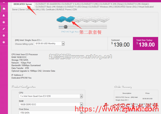 上面这款机器请记得使用优惠码,月付104.25美元,季付299.25美元,半年524.25美元,年付922.5美元(周期越久价格越便宜)。在会员中心的位置如图(头部选择DEDICATED Server,然后选择第二款套餐,请留意图中优惠码输入款):