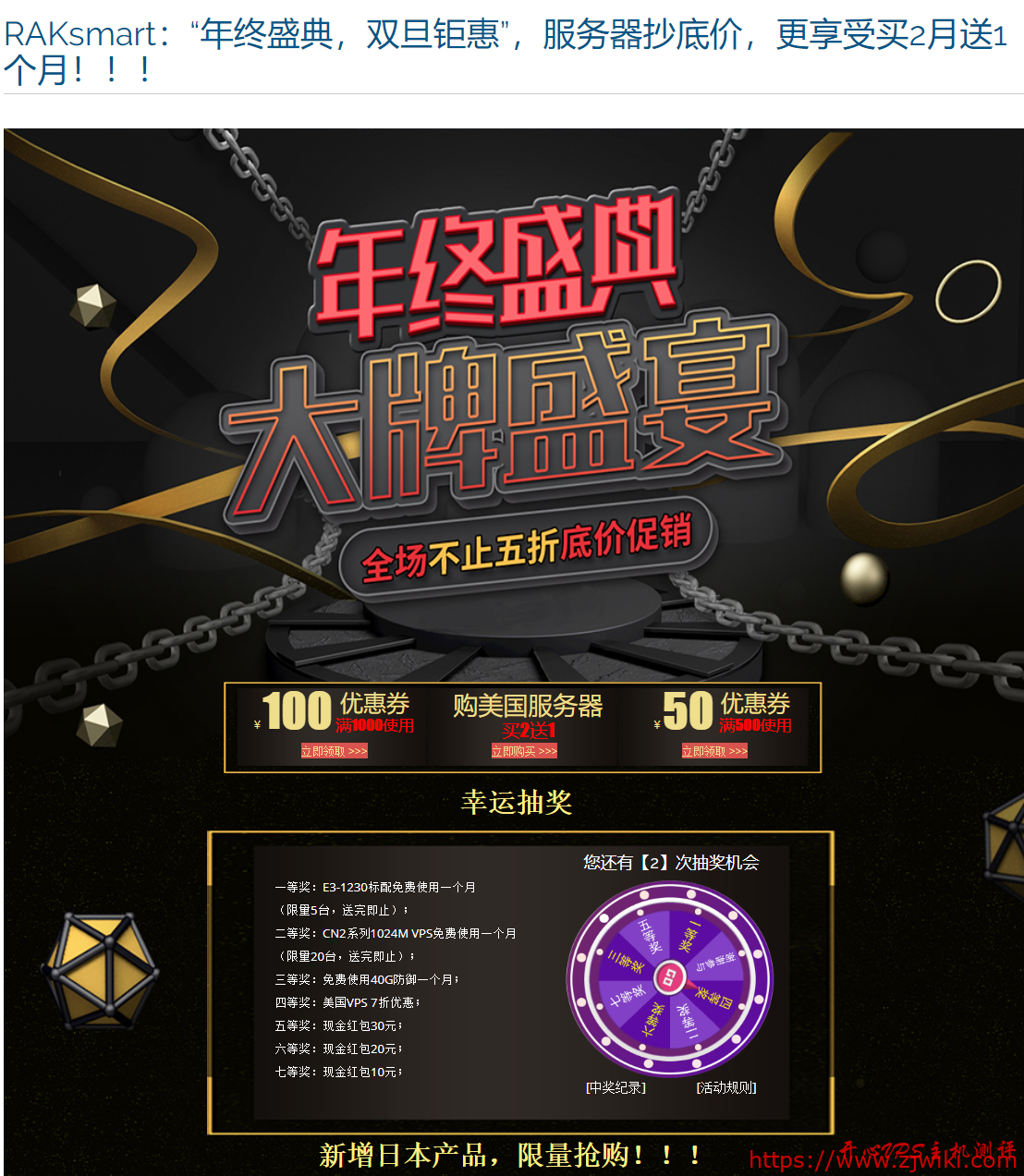 RAKsmart发布了迎接圣诞和元旦新年的活动,这也是2019年的最后一次活动,涉及的产品和力度都比较大,包括美国圣何塞、中国香港、日本等爆款独立服务器秒杀,美国服务器免费送防御,美国服务器买2个月送1个月使用时间,BGP线路1G/10G端口不限流量服务器买1个月送1个月,还可以直接在他们的网站参与抽奖获得优惠。
